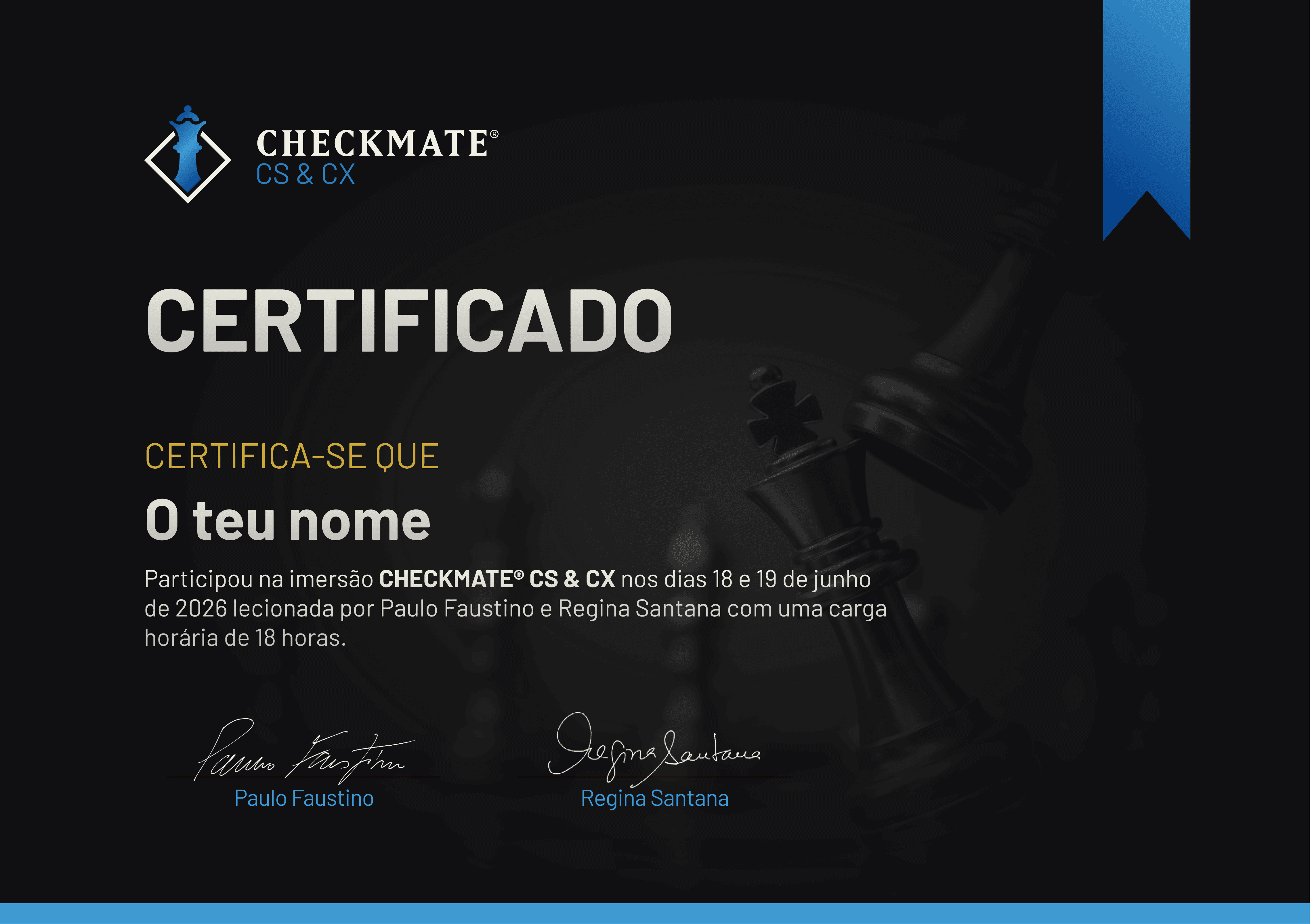 A imersão CHECKMATE®: CS&CX inclui a emissão de certificado de participação para todos os participantes e colaboradores.